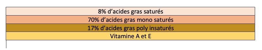 L’huile d’olive est très riche en acides oléiques, en vitamines E et en polyphénols. L’huile d’olive est l’ingrédient principal de toutes les recettes naturelles, un des plus anciens remèdes de grand-mère. La composition des graisses dans l’huile d’olive est très semblable au sébum de la peau. L’huile riche en vitamine A qui prévient le dessèchement de la peau et des lèvres.