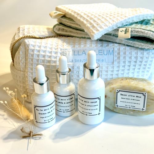 Parfait pour offrir un cadeau original et naturel et faire découvrir les produits Stilla Oleum. Voyager léger tout en gardant une routine complète